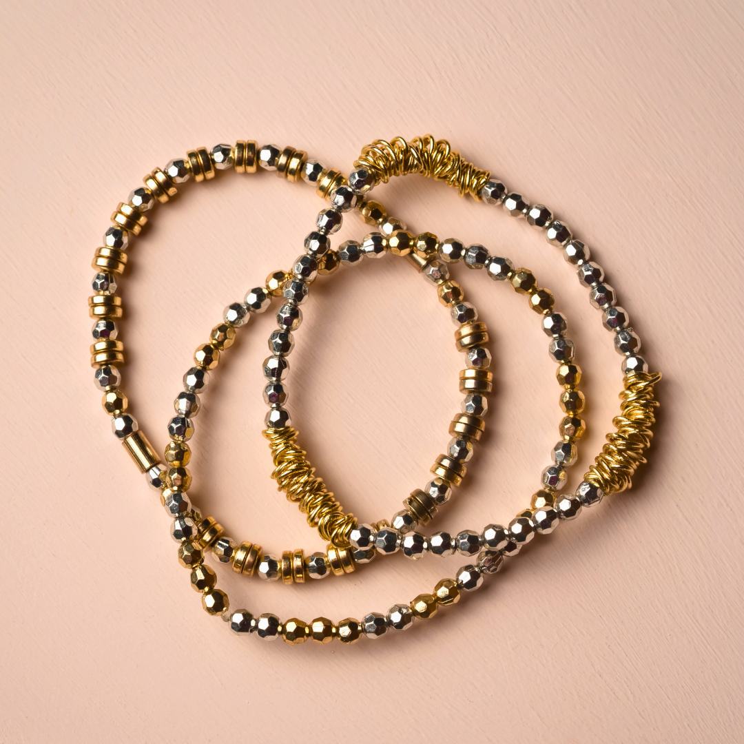 Delicate yet dazzling, these stackable mixed-metal bracelets bring effortless sparkle to any look. Their blend of gold and silver tones makes them a versatile holiday favorite—perfect for creating your own arm party or pairing with other festive pieces.